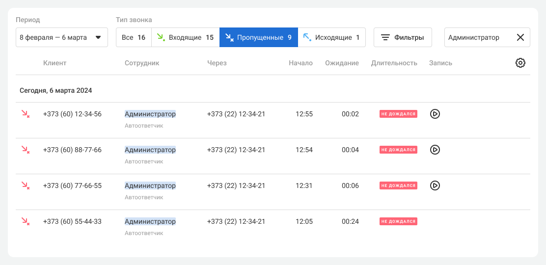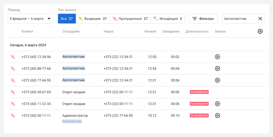 Если вы хотите найти все сообщения, оставленные на персональный автоответчик конкретному сотруднику, напишите в строке поиска его имя и выберите тип звонков «Пропущенные».