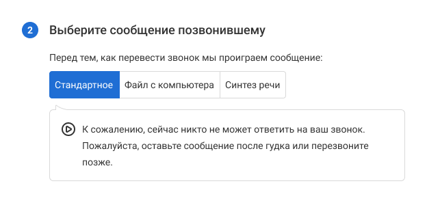 По умолчанию Виртуальная АТС будет проигрывать стандартное сообщение с предложением оставить голосовую почту, но вы в любой момент можете заменить его на свой файл с компьютера или озвучить текст сообщения на автоответчик с помощью функции «Синтез речи».