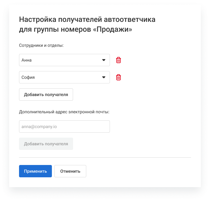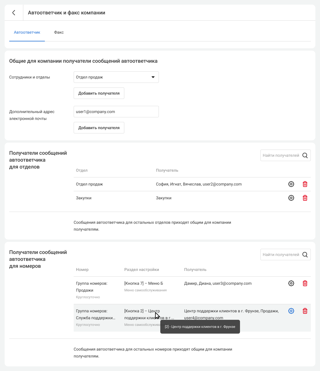 Чтобы изменить настройки, кликните на шестеренку справа от выбранного номера. В открывшемся окне вы можете добавить или удалить получателей автоответчика, а также указать дополнительные электронные адреса, куда будут отправляться голосовые сообщения.