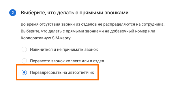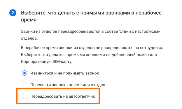 3. Настраивая действия с прямыми звонками в нерабочее время, выберите «Переадресовать на автоответчик».