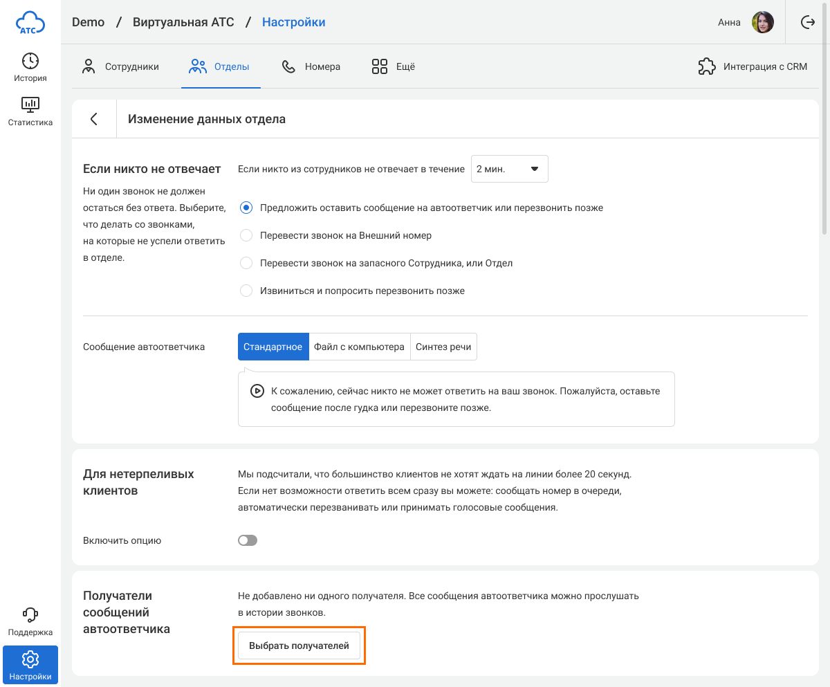 По умолчанию будет выбран общий автоответчик компании со списком получателей, который вы настраивали ранее. Чтобы изменить настройки автоответчика, в блоке «Получатели автоответчика» нажмите на кнопку «Настроить получателей».