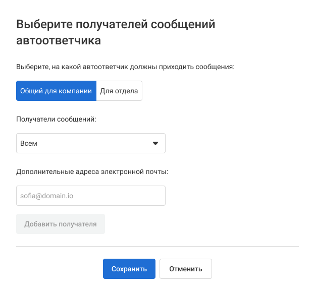 - Общий для компании — голосовые сообщения будут приходить всем получателям сообщений общего автоответчика компании;