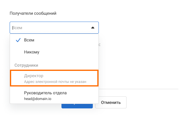 Если выбрать в списке получателей не конкретного сотрудника, а отдел, то голосовые сообщения будут направляться на электронные адреса всех сотрудников этого отдела, у кого указана почта в профиле.