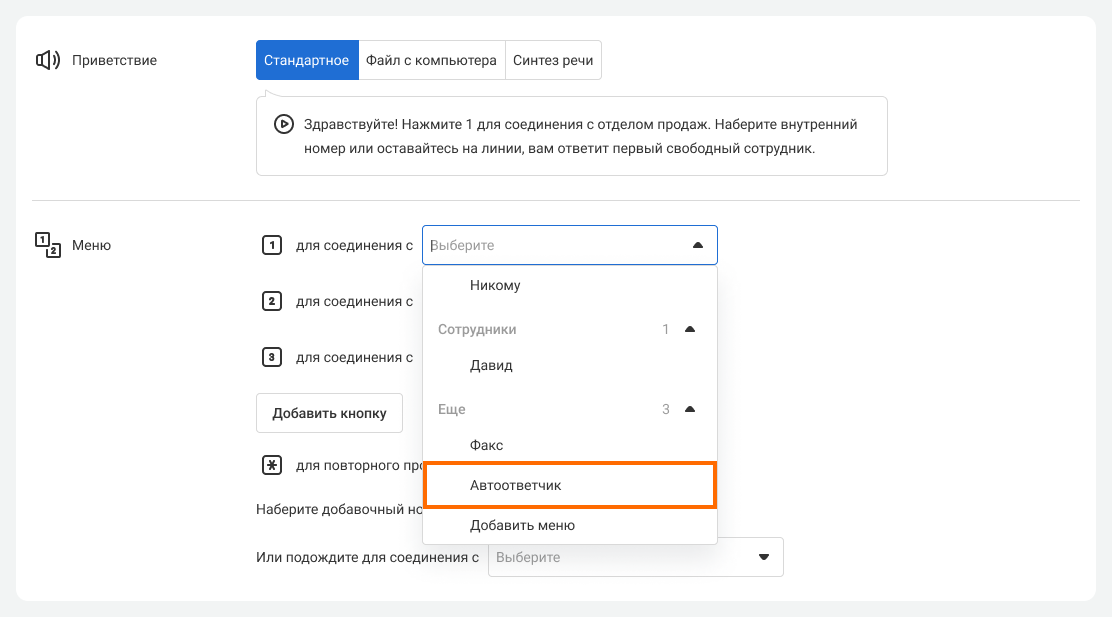 Для этого в настройках меню укажите, что при нажатии одной из кнопок вызов будет направлен на автоответчик.