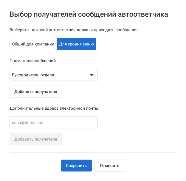 Выберите, на какой автоответчик должны приходить сообщения: общий автоответчик компании или автоответчик отдела. Получатели автоответчика отдела настраиваются таким же образом, как получатели автоответчика уровня меню.