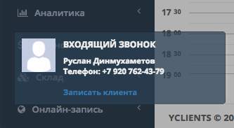 Интеграция с Виртуальной АТС позволит вам уже при входящем звонке видеть имя звонящего клиента и не переспрашивать номер телефона при записи. Вся история и записи звонков будут зафиксированы в карточке клиента.