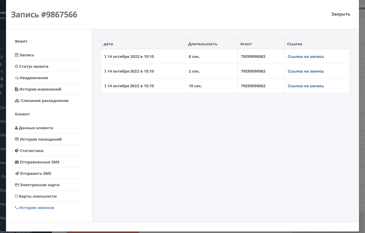 В карточке записи есть раздел «История звонков», где вы увидите все звонки клиента в вашу компанию и можете прослушать записи этих разговоров.
