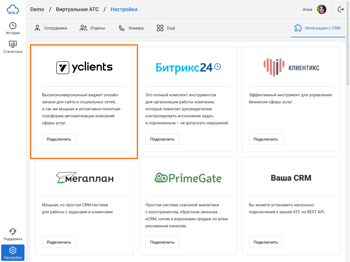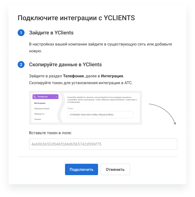 Скопируйте токен телефонии и перейдите в ОАТС. В разделе «Настройки» в правом верхнем углу выберите «Интеграция с CRM». В списке CRM-систем найдите YClients и нажмите «Подключить».