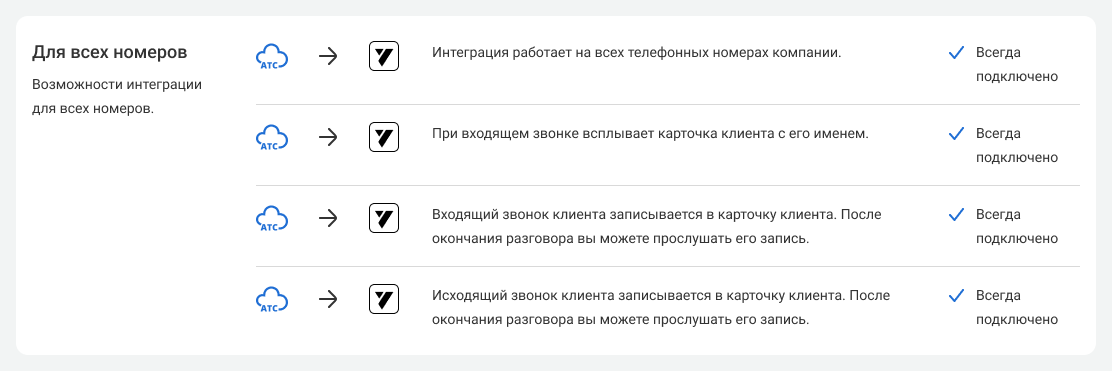 Любая ошибка в номере приведет к тому, что звонки не будут обрабатываться, также не будут передаваться звонки, если номера телефонов заблокированы в АТС. При таких статусах никакая информация о звонках в YCLIENTS отображаться не будет.Все настроили? Начинайте пользоваться интеграцией с YClients.