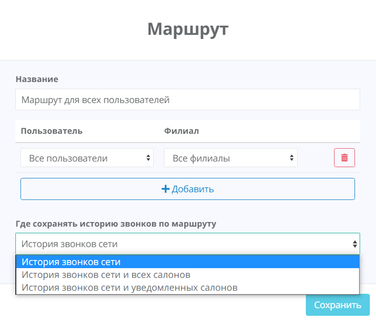 - История звонков сети и уведомленных салонов – всплывающее окно о звонке будет появляться в том филиале/филиалах, которые будут выбраны в этом маршруте.