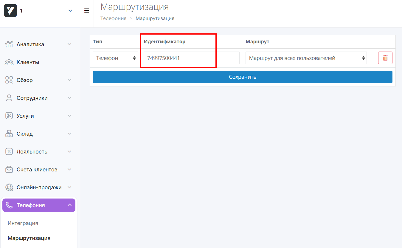 4. После настройки маршрута свяжите его с номером телефона/идентификатором абонента телефонии, SIP, на который поступают звонки. Для этого перейдите в раздел Маршрутизация.