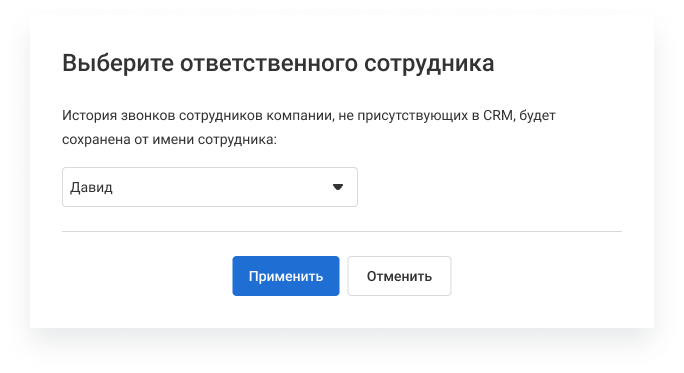 История звонков ваших сотрудников, не присутствующих в Zoho, будет сохранена от имени выбранного пользователя. Этой опцией можно пользоваться, если вы не сопоставили всех менеджеров или если у вас есть сотрудники, которые не работают в Zoho, но могут звонить клиентам (бухгалтер, курьер и т.п.). Для таких звонков не будут созданы контакты, сделки и лиды, но история и запись разговоров будет храниться в Zoho.