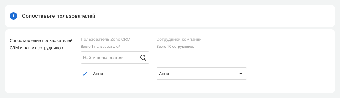 3. Сопоставьте всех пользователей АТС с пользователями Zoho, чтобы системы могли правильно отражать связанные с ними события. В Zoho CRM будут заноситься звонки только сопоставленных пользователей. При добавлении новых сотрудников в будущем тоже необходимо будет их сопоставить.